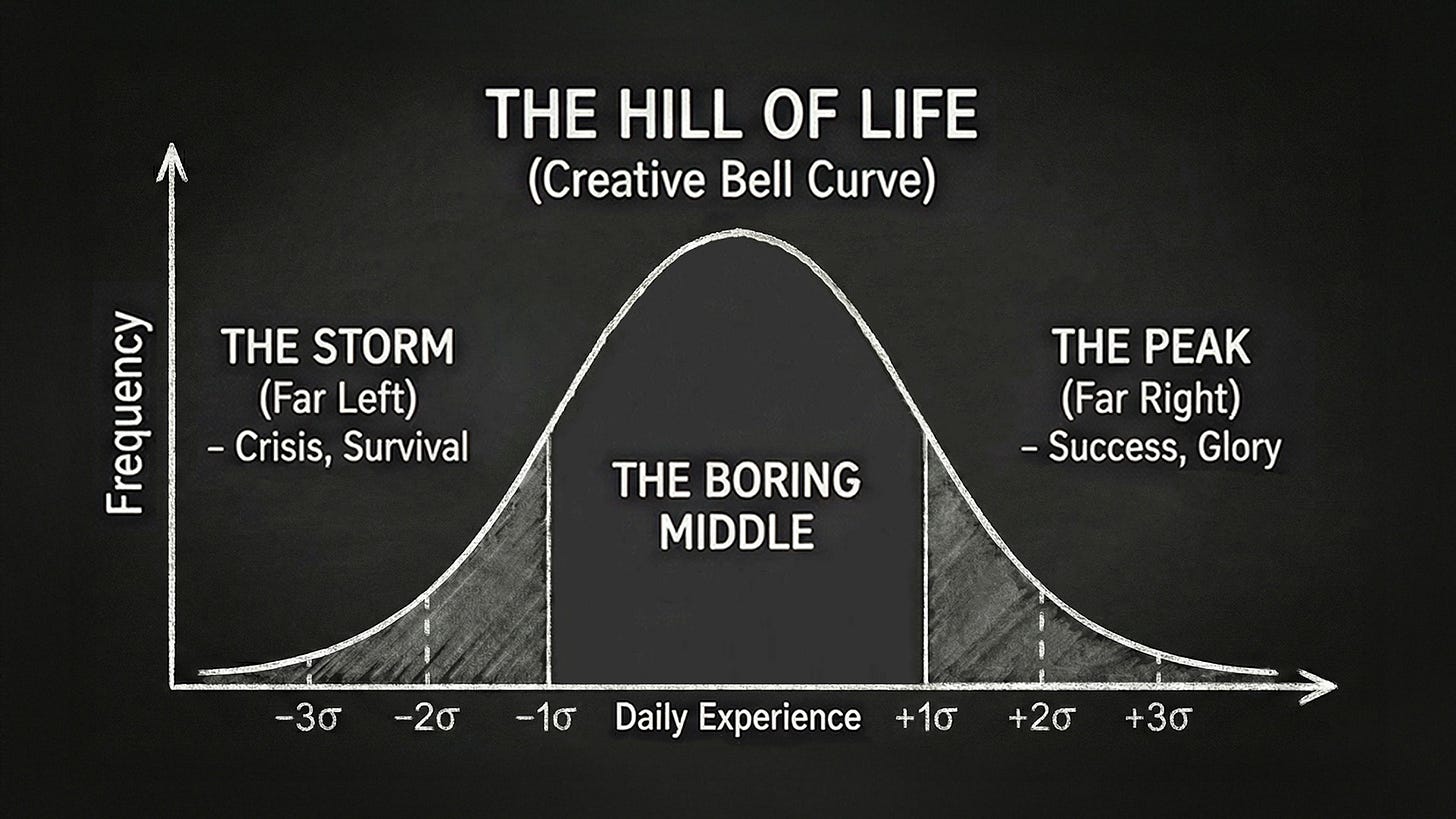 On the far left is The Storm. These are crisis days filled with burnout, loss, mistakes, and emergencies. On this side of the curve, creativity isn’t the priority. It’s about survival. These days feel overwhelming when you’re in them, but over the span of a year, they’re rare.
